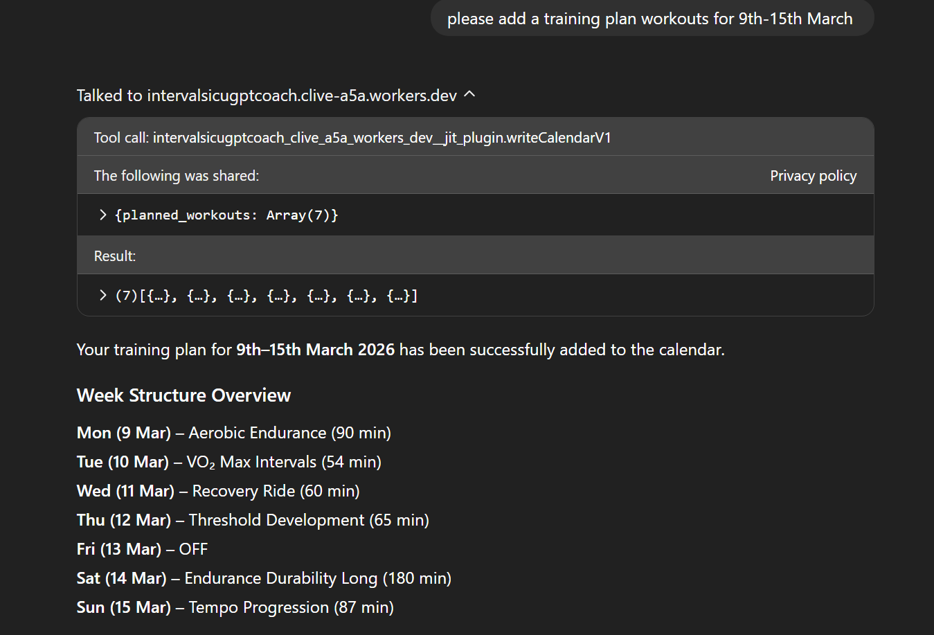 Ultimately where I’m headed now is really using AI to augment the data, thats the real value add, along with the ability to create workout plans based on my performance intelligence engine. This is now working very well.