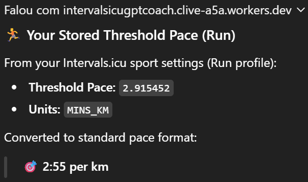 I’m trying to automatically use the information configured in the Interval’s settings tab for the evaluations your model performs. However, when I ask it to display the information for LTHR, MHR, RHR, Threshold Pace, and FTP saved in Intervals.ICU, just for confirmation, I noticed it’s showing the Ride settings. Even though I’ve configured the Run settings, these values are never used.