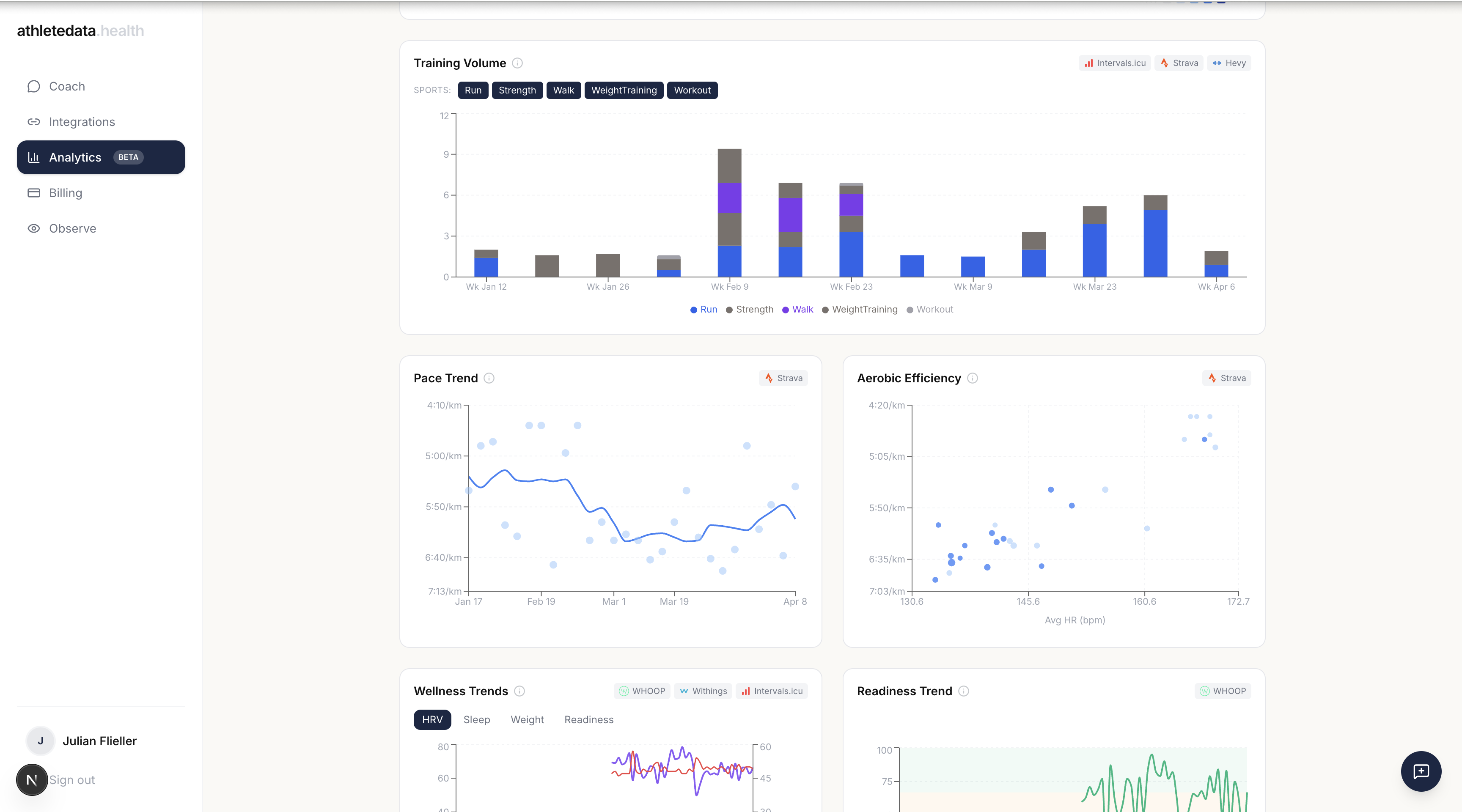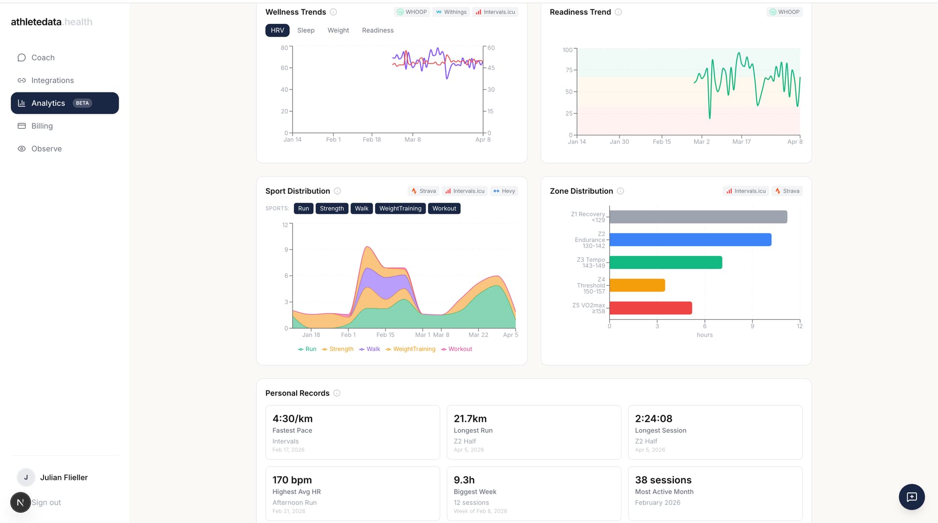 Shipped the Analytics dashboard (screenshot above): training volume, pace trends, aerobic efficiency, wellness & readiness trends, sport/zone distribution, all in one view