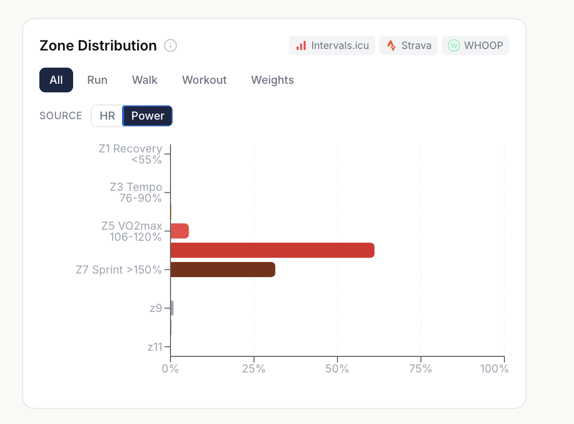 HR Zone Distribution: computed from raw Strava HR streams using your